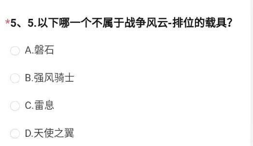 以下哪一个不属于战争风云排位的载具?在新模式的排位当中,玩家可以选择的载具来进行游戏,但是有一款载具是在这个排位当中的,所以小伙伴们知道是哪一个载具嘛?下面就是小编给出的答案分享,希望可以帮助到大家。
