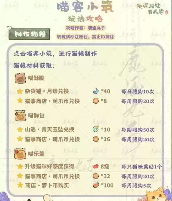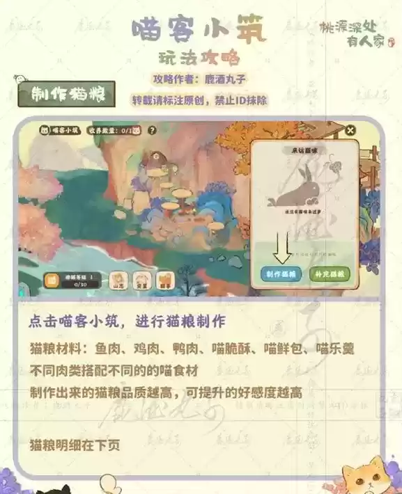 桃源深处有人家喵客小筑是游戏中的玩法,不少玩家想要知道这个该怎么玩。其实这个玩法还是很容易的,玩家可以制作猫粮等。因此想要知道这个玩法的,就让小编给大家详细的讲讲,一起来看看吧。