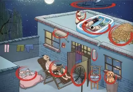 答案:【螺旋风扇、避暑山庄、棒棒冰、充气水床、爆玉米花、高温天气、狗泡水缸、冰镇奶茶、落地扇、防晒冰袖、降热帖、空调挂机】