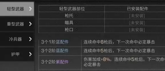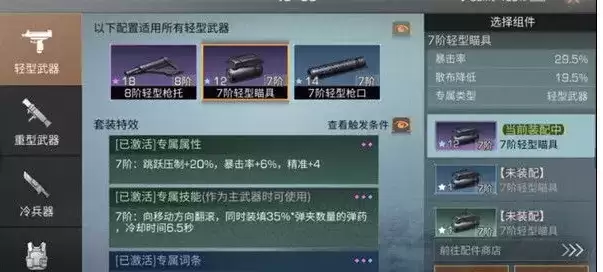 配件方面的话我们还是选择散布降低的比较好,所以玩家可以重点升级瞄具等级,这样才能尽可能的去减少散步的偏差率,也可以配置三级或者以下的配件的专属词条,获得必定暴击的属性;