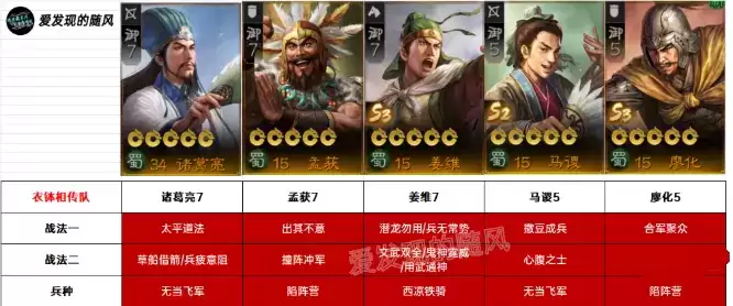 诸葛亮、姜维和马谡三人有【衣钵相传】缘分,每回合都能提高2%全属性,可叠加8次。这个效果对高属性的姜维和需要召唤小兵的马谡来说都非常好用,在孟获和廖化的辅助下,后方诸葛亮和马谡不停释放战法,给姜维做好斩杀铺垫。