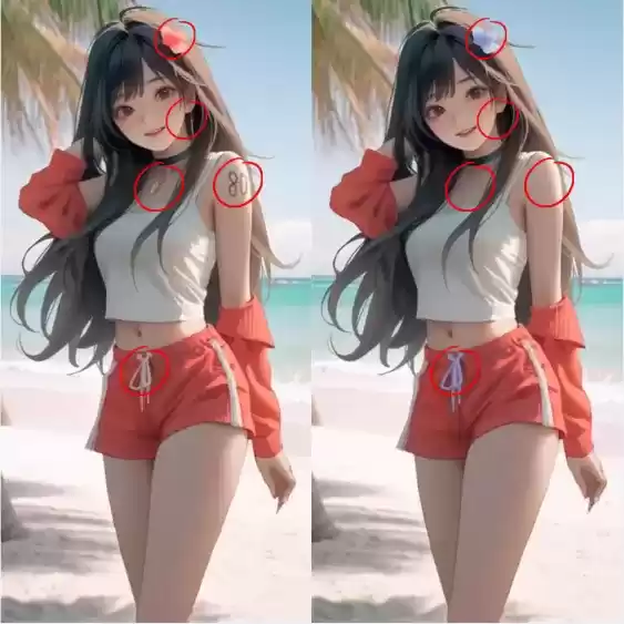2、五处不同:头上戴的花、耳饰、项链、胳膊上面的数字、裤带绳