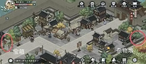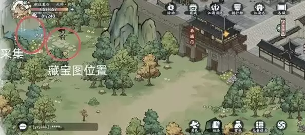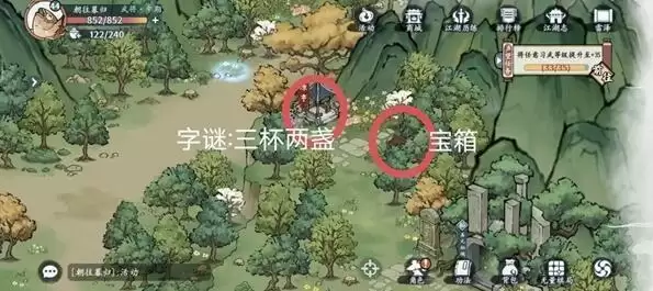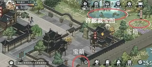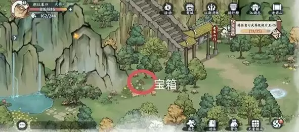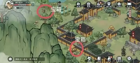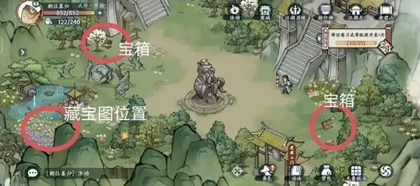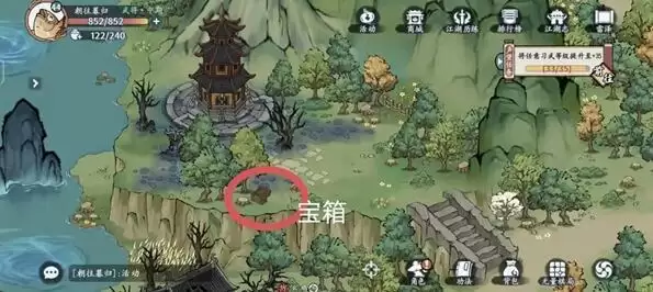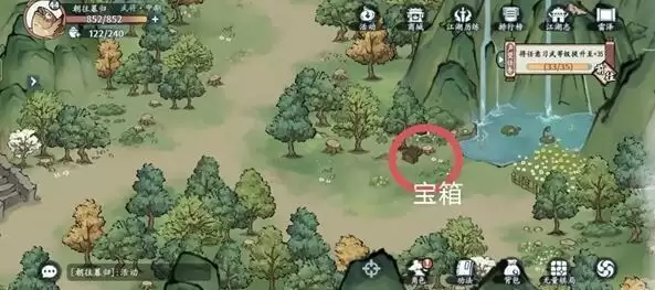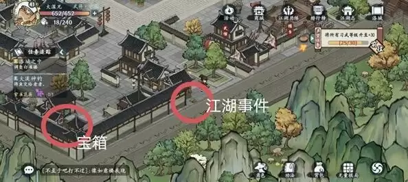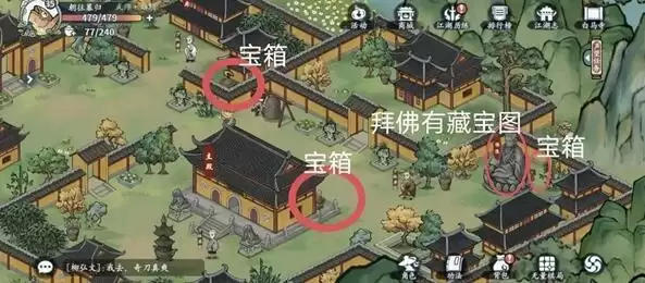4、宝箱分别在左上中间和右下,藏宝图在左上,江湖事件在右边。