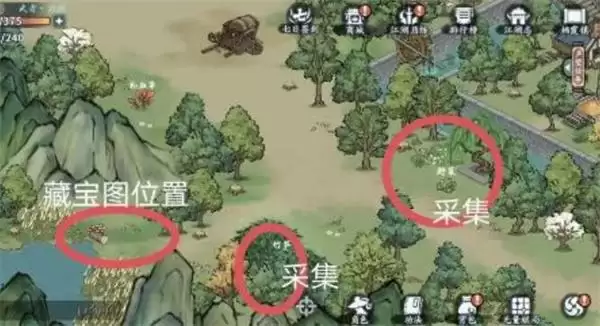 4、我们继续看这个图下的位置上有两个采集点,耳环会在山的旁边返现藏宝图。