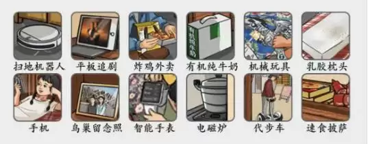 答案:【手机、智能手表、机械玩具、乳胶枕头、平板追剧、代步车、鸟巢留念照、电磁炉、炸鸡外卖、有机纯牛奶、扫地机器人、速食披萨】