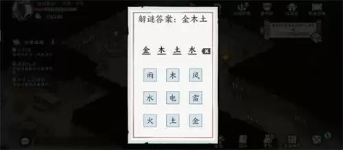 2、谜题的答案是金木土,我们填入水,因为金克木,木克土,土克水。
