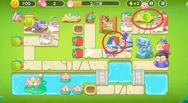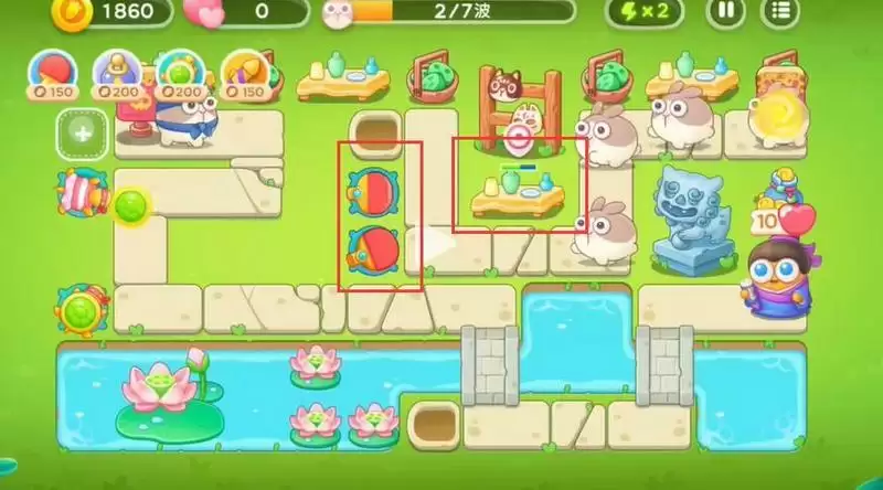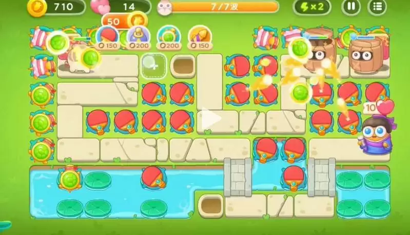 1、放上一个乌龟用来清理左边的一排道具,获得金币给乒乓球升级消灭兔子。