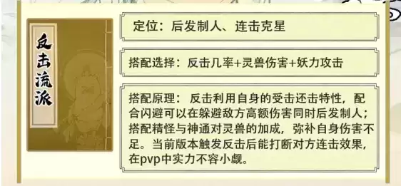 搭配原理: 反击利用自身的受击还击特性,配合闪避可以在躲避敌方高额伤害同时后发制人搭配精怪与神通对灵兽的加成,弥补自身伤害不足。当前版本触发反击后能打断对方连击效果,在pvp中实力不容小觑。