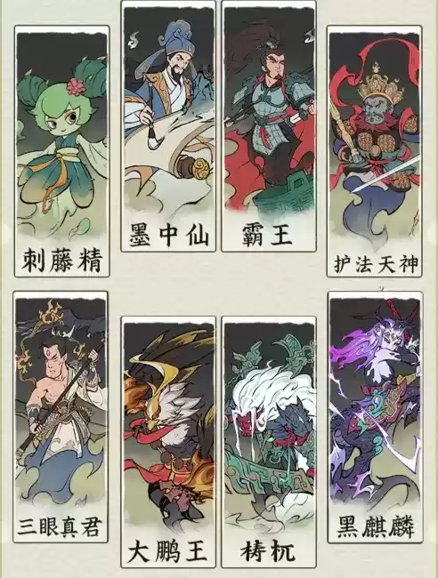 组合:刺藤精、三眼真君、墨中仙、霸王、大鹏王、祷机、护法天神、黑麒麟。