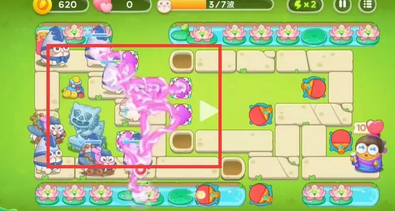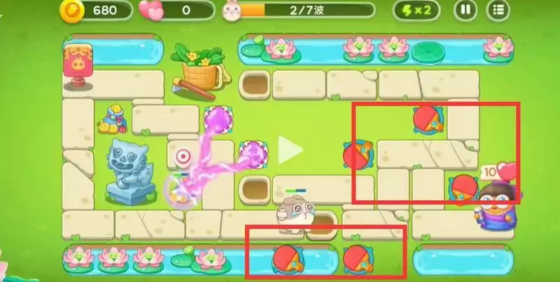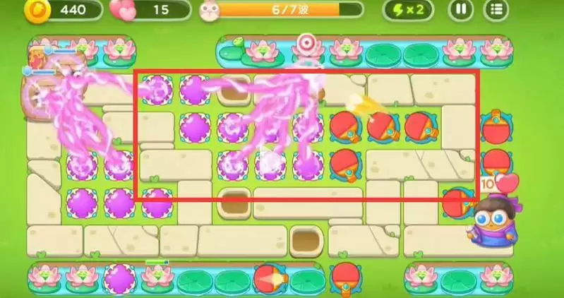 5、逐渐的将中间的空位摆满之后对池塘里的荷花进行攻击。