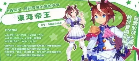 简介:身材小巧,开朗活泼,有着闪闪发亮的夺目笑容的美少女马娘。由于身体轻巧,脚步也很轻盈,那跳跃般的独特步法被称作「帝王跳」。性格争强好胜,略有些傲慢。自尊心很强,易怒,但面对比赛的热情比任何人都要强烈。对于被称作「皇帝」的传说中最强马娘怀有强烈憧憬,继承其意志成为「帝王」乃是梦想。