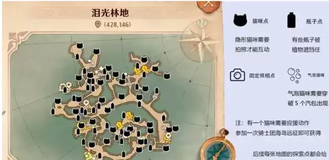 1.森之国度冬泉岭喵咪位置、瓶子位置、固定照相点、气泡喵咪位置、npc位置如下: