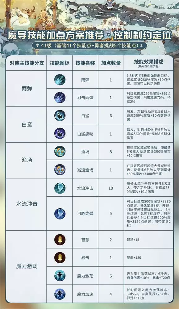 后续优先级:各分支技能加点优先级为:水流奔涌>白鲨狙击>丰收渔场>跟踪雨弹>魔力激荡。
