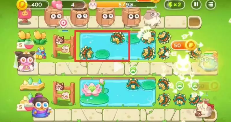 3、攻击兔子的同时将池塘的花打掉放上炮塔。