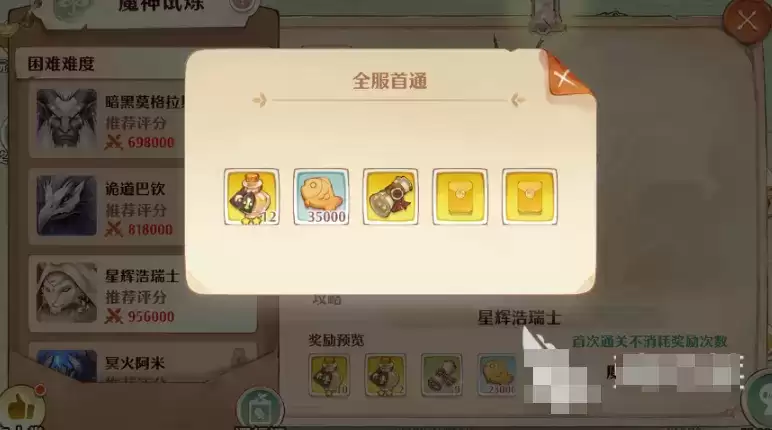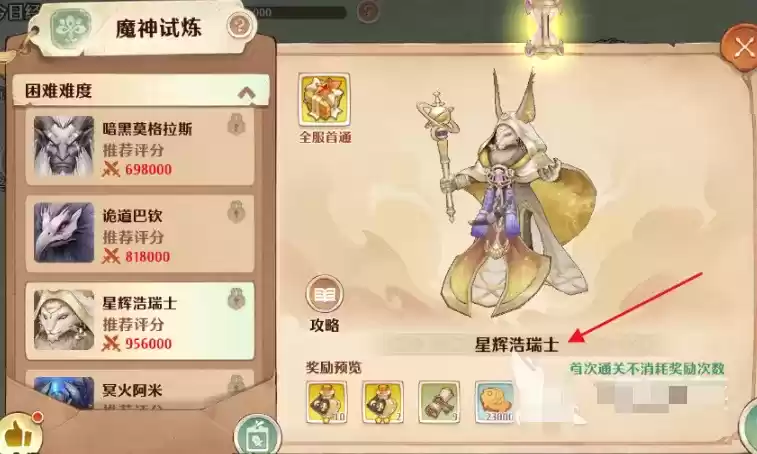 小编会给大家详细的介绍一下星辉浩瑞士的背景,方便玩家们了解,知己知彼才能百战百胜,这个原则大家都是了解的,星辉浩瑞士是【魔神试炼】困难副本中的第三个难度,挑战之前,玩家们需要看一下自己的评分是否达到了最低标准,目前星辉浩瑞士挑战推荐战力评分在95万左右,玩家们首次挑战是不会消耗奖励次数的。