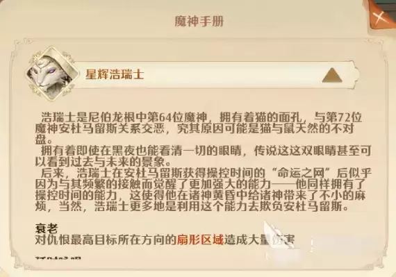 魔神手册星辉浩瑞士浩瑞士是尼伯龙根中第64位魔神,拥有着猫的面孔,与第72位魔神安杜马留斯关系交恶,究其原因可能是猫与鼠天然的不对盘。拥有着即使在黑夜也能看清一切的眼睛,传说这这双眼睛甚至可以看到过去与未来的景象。后来,浩瑞士在安杜马留斯获得操控时间的“命运之网”后似乎因为与其频繁的接触而觉醒了更加强大的能力——他同样拥有了操控时间的能力,这使得他在诸神黄昏中给诸神带来了不小的麻烦,浩瑞士更多地是利用这个能力去欺负安杜马留斯。从背景故事中,玩家们可以了解到这个角色的技能大概是有一个很特殊的控制技能。
