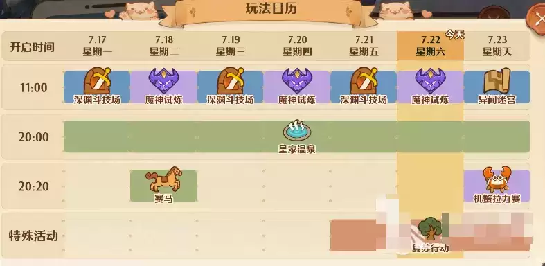 最后一个功能的话是“玩法日历”,它不同于今日活动,它会呈现最近这一周开放的限时活动,玩家也可以因此提前安排自己后续的发展规划。
