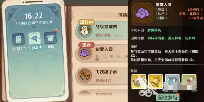 除了比较固定的玩法之外,游戏中增加了限时玩法,让玩家们在游戏中可以有更好的体验,限时活动目前是有4个的,分别是【东泉雪球赛】,【紫雾入侵】,【飞跃果子林】,【光耀联赛】,这几个是游戏中比较特殊的本,玩家们最好是都参与进来,因为掉落的奖励还是比较丰富的。