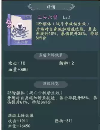 2、法天象地和三头六臂能够在增加我们暴击概率的同时增加暴击伤害,灭心魔种也能够提高我们的暴击伤害,解尸法的复活能够增加容错率,也可以换成金鸡啼鸣,这都根据玩家自己的灵兽做出相应的调整。