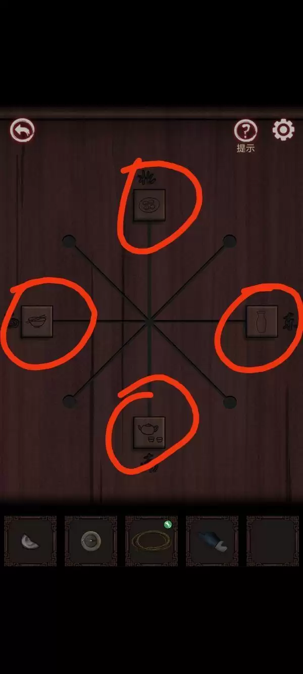 8、观察之前指南针三个地方游戏线索古董方位,剧情对话已经给,再加上画红圈那几个古董方位,把古董像移五角星那样一点一点移动,移动到你用指南针看到位置。