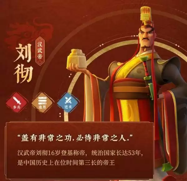 在万国觉醒游戏中,八代步兵刘彻是9月三周年庆版本中,即将上线的全新武将角色,也是全新皇帝角色,史称汉武帝。相信有很多玩家都想要了解,这个皇帝角色的技能效果与强度吧?因此今天小编就给大家带来了,最新万国觉醒八代步兵刘彻强度介绍,供大家来进行参考和学习。