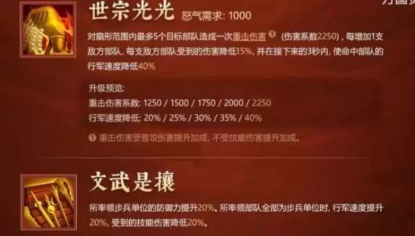 2、文武是攘:所率领步兵单位的防御力提升20%。所率领部队全部为步兵单位时,行军速度提升20%,受到的技能伤害降低20%;