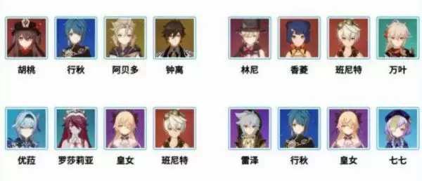 1、推荐使用香菱、安柏、柯莱、诺艾尔这套或者下图四套高爆发阵容。