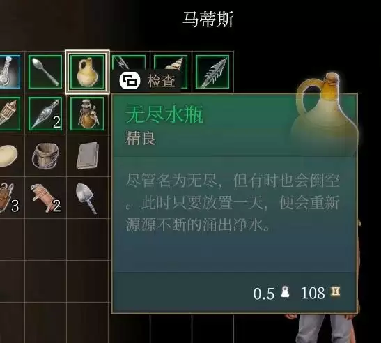1、无尽水瓶描述里看起来似乎十分厉害,可以源源不断生成水,其实商人马蒂斯是个骗子,这就是一个普通的水瓶。