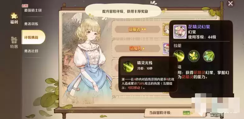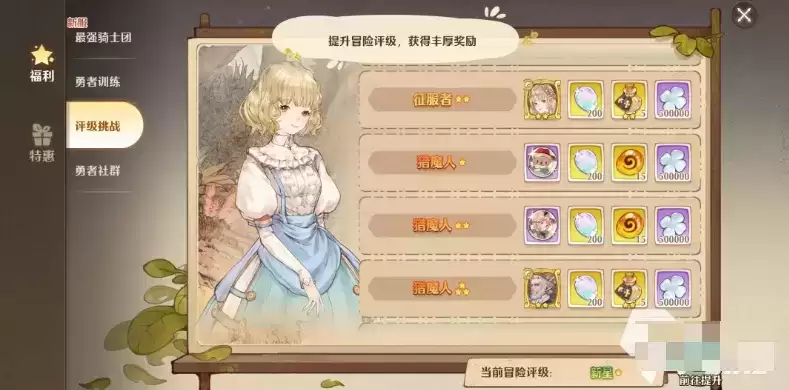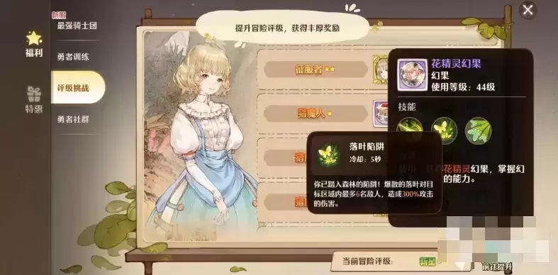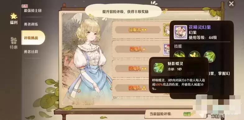 完成冒险者公会支线任务需要达成泪光10000的信物值,这个要求比较高。那么玩家也可以通过在游戏中达成了评级的要求和战力要求之后去进行评级挑战。评级越高的话每日能领取的补贴奖励也就会越丰富。在玩家们达成了猎魔人的评级之后,就能获得幻果的奖励了,包括了流浪蘑菇和花精灵。