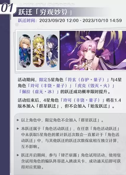 2、该活动结束后,4星角色玲可(丰饶量子)将在1.4版本中正式加入群星跃迁,但不会加入始发跃迁。