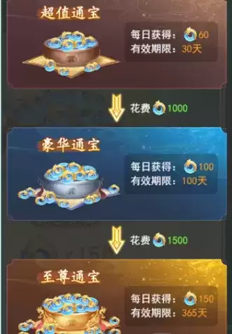 不要以为只是一个30元的月卡,而是30元一年的劲爆福利,根据下图花上2500灵玉将永安通宝升级下,就可以获得一年每天150灵玉的奖励,最终你将可以领到高达54750的灵玉奖励