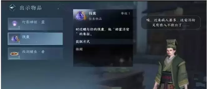 3、然后我们就在对话当中得知到,原来他是帮助没有钱的人家送去食物和钱财,完成对话之后我们就获得到钱囊,同时还解锁该传闻。