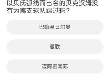 问题九:以贝氏弧线而出名的贝克汉姆没有为哪支球队踢过球?