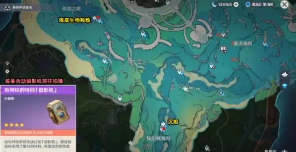 1、记得带上【布列松的特别留影机】,位置如下,沉船位于埃尔顿海沟锚点边,海底生物残骸位于希望之路锚点旁边,传送过去就能直接拍摄了。