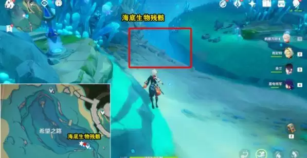 3、传送至希望之路传送点,面向西方向,按Z拍摄海底生物残骸(就是下图红框标示的骸骨)。