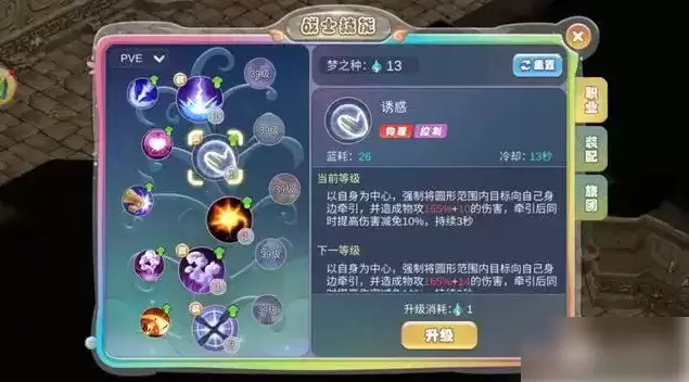【诱惑】:技能有牵引效果;分支额外提升技能伤害,诱惑结束后定身目标。