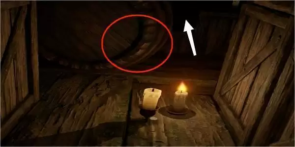 10.这个时候,我们贴近木箱边上,等木桶撞上来,跳上木桶,随着木桶的方向到达我们需要点燃蜡烛的地方。之后回路返回再按照前面的方法点燃最后一个蜡烛。