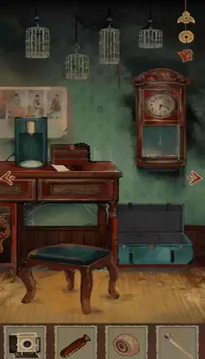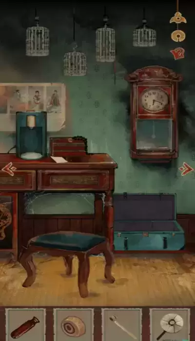 2、其次按照旗袍下的鸟类图案形状与高度,把鸟笼吊到对应位置。椅子上掉落个老式钟摆,把它安在钟表上。