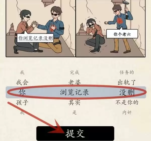 3、第三幅图左边蓝色衣服的人拿着锤子说“你个老六”。
