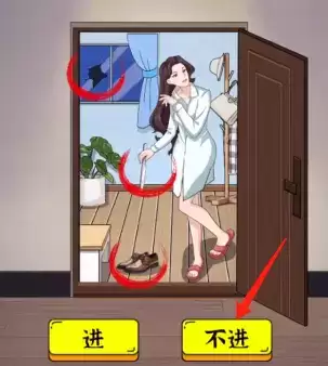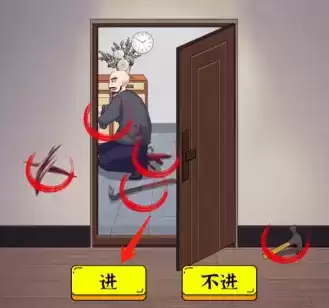 2、门口的不明标记,门口有个锤子,男人边上有红色液体和铁棍,选择进。