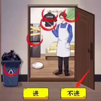 3、冰箱上有胶带,挂着同款制服,手里拿着锅铲,散发出臭味,门口的垃圾桶满的,选择不进。