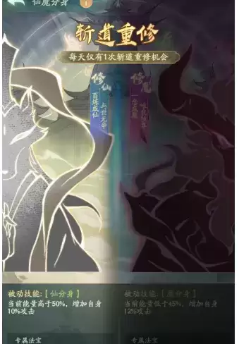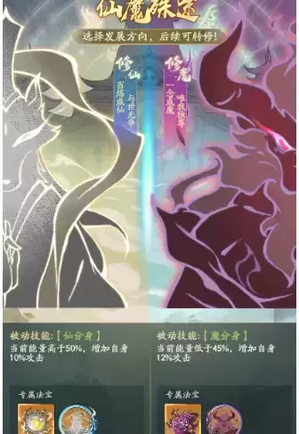 3、道友在选择为仙或为魔的道途后,道友将拥有各自的专属法宝与被动技能。