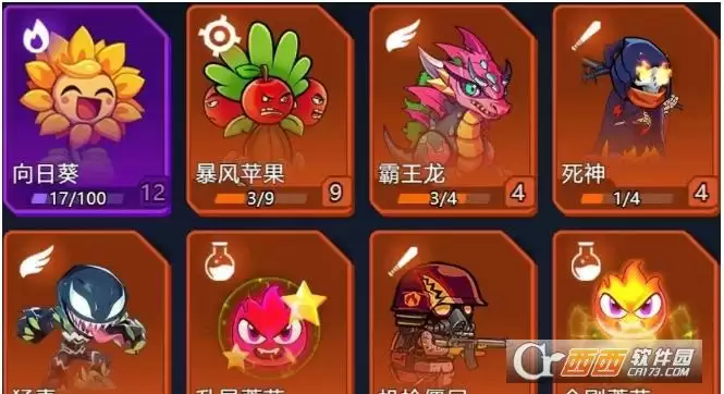 向日葵、暴风苹果、霸王龙、死神、猛毒、机枪僵尸、升星蘑菇、金刚蘑菇
