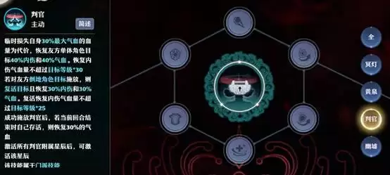 判官则是以自己气血为代价恢复友方单体内伤与气血,既可以是敏加点的次输出鬼道来救人用,也可以是主输出的尾速鬼道来拉人,具体情况具体应对。判官是超强的单体恢复技,极限救人,保内伤队友。只是施放需要临时扣除自身30%最大气血,所以在施放的时机的把握上还需谨慎,只要回合末不倒地这30%气血还是可以恢复的。