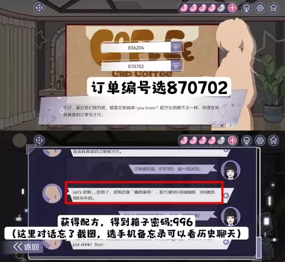 3、之后使用手机拨打电话来获得咖啡配方,订单编号选870702,最后获得配方,得到箱子密码【996】。