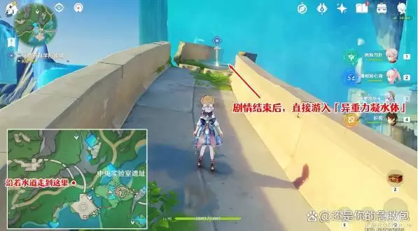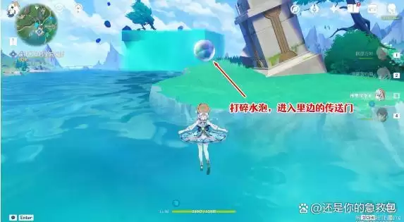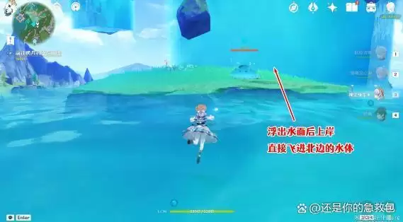 2、进入异重力凝水体之后,玩家要浮到水面上,在岸上就会有一个大泡泡;