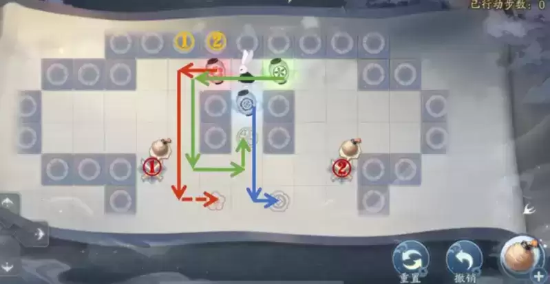 2、兔子来到红灯笼左侧,往右推1格,兔子走到红灯笼上方,往下推4格顶头,兔子回到红灯笼右侧,往左推,把红灯笼推进红格子里。