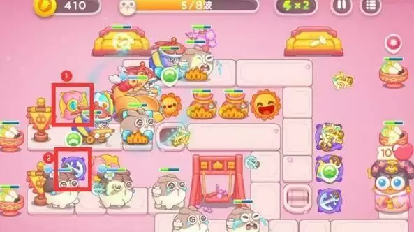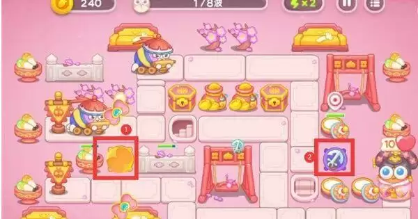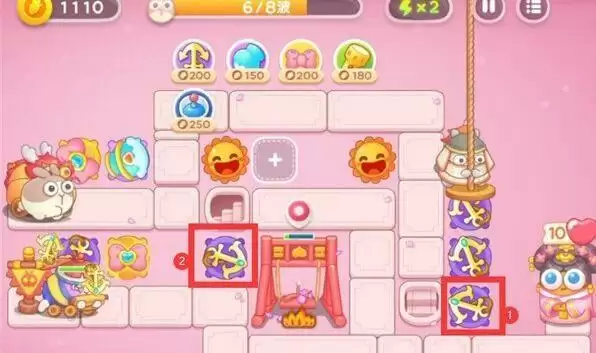 1、第一步,在左边放置蝴蝶结炮台,升到二级。第二步,右边放置船锚炮台,有钱的话也要升级
