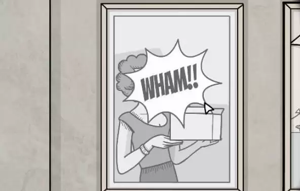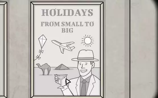 5、点击墙面的画,按照酒杯-帽子-风筝-骆驼-飞机- 金字塔-太阳的顺序就可以获得一把钥匙。
