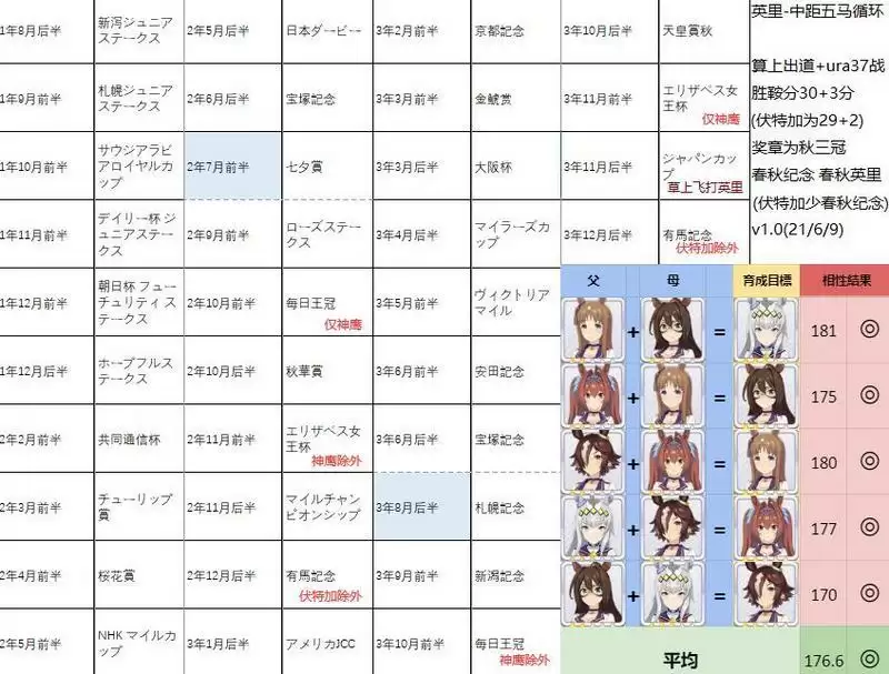 2、要注意伏特加第一年12月上的育成目标赛是阪神F而不是朝日杯,会损失1点胜鞍,伏特加/大和赤骥为了春秋英里奖章需要打第二年11月下的英里G1,会导致三连战。